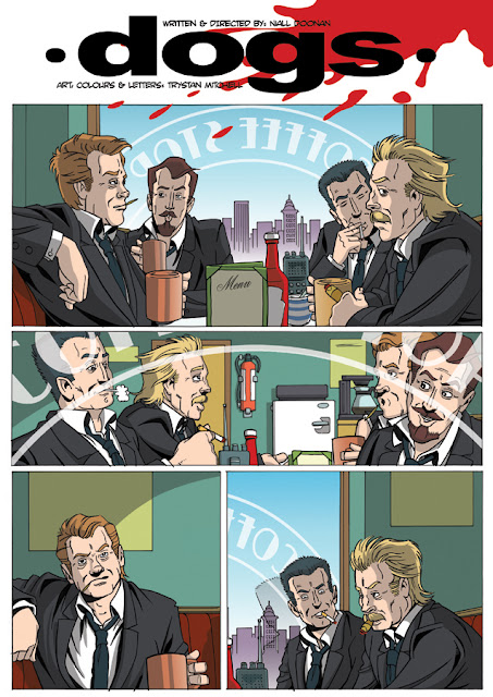 Here's some of the play stuff: in looking to develop my comic work I've been lucky enough to be given a script or two by some talented writers I met through the message boards on Mark Millar's Millarworld site. I've been wanting to develop my narrative abilities on some more mainstream comic book tales, as well as the more underground nature of the work I've been doing on Dana Larsen's Hairy Pothead title; the first are a page and a half of the artwork for Niall Doonan's Dogs webcomic he has in development for Get Bent productions. I'm unable to give so freely of my time that I can make their fortnightly deadline, but any artists out there interested in working with a talented new writer who have time and pencils to offer then I'd be happy to pass on any communications.